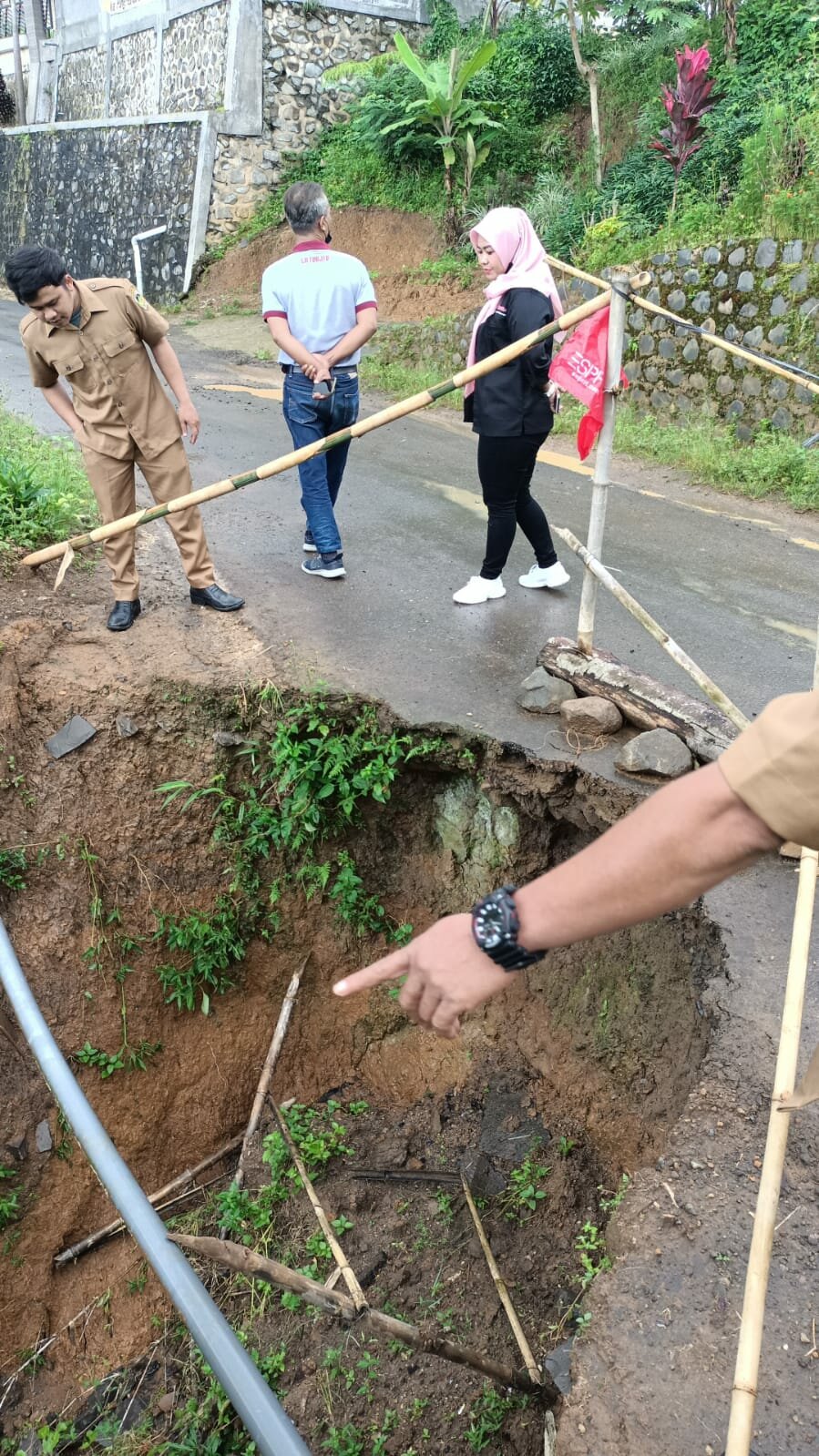 Jalan tersebut nyaris terputus karena disebabkan tanah pada bagian bawah jalan tergerus aliran air yang disebabkan pada curah hujan yang tinggi sejak beberapa bulan terakhir.