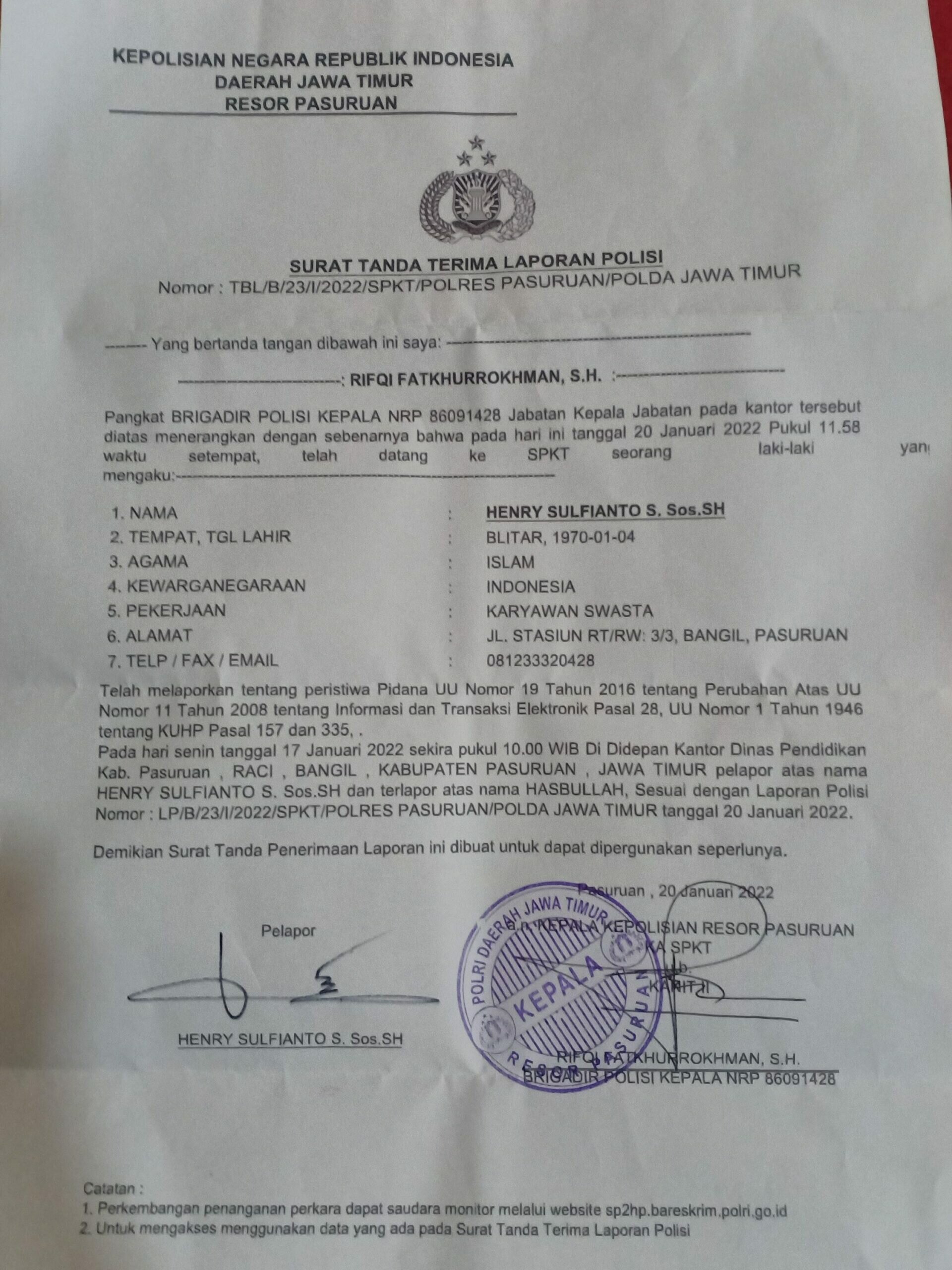 PASURUAN, TALIGAMA.NEWS – Pimpinan Redaksi media online Taligama.com angkat bicara menanggapi ucapan Kepala Dinas pendidikan Kabupaten Pasuruan yang sempat viral di medsos seperti layaknya seorang preman,Kamis (20/1/22).